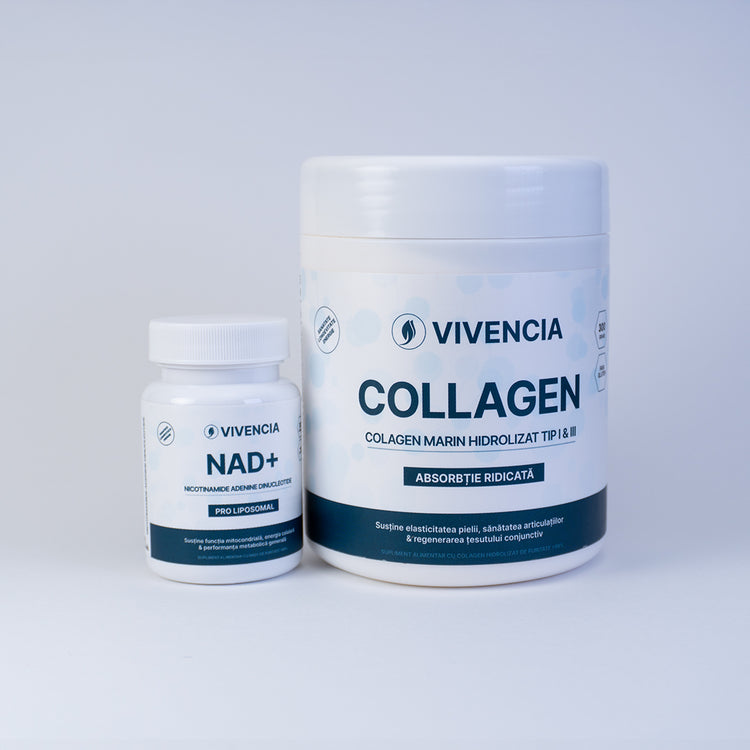 NAD⁺ este coenzima vitală care alimentează celulele cu energie și activează procesele de reparare, în timp ce Colagenul Marin susține elasticitatea pielii, sănătatea articulațiilor și rezistența oaselor. Împreună, creează o combinație unică: mai multă energie, claritate mentală și un aspect vizibil mai tânăr din interior spre exterior.