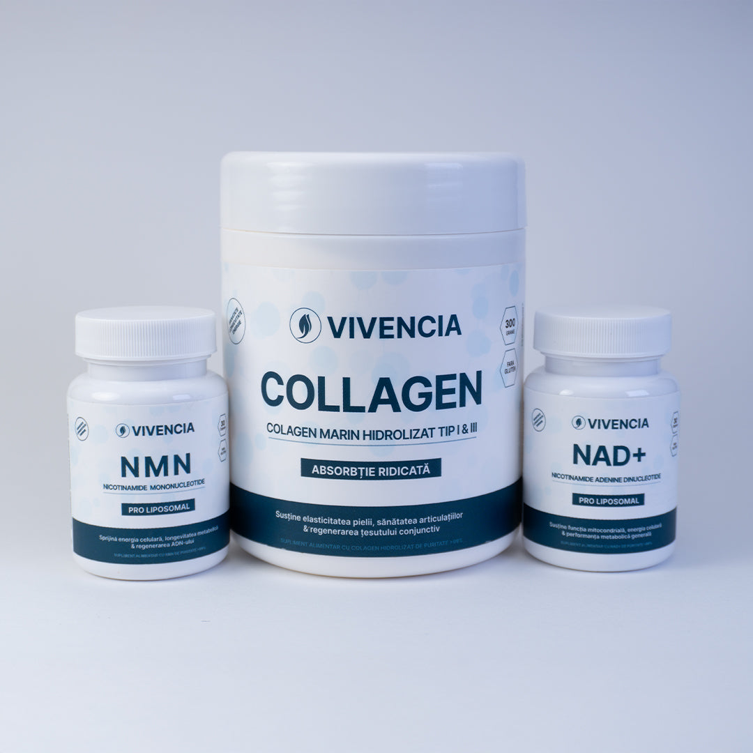 NMN și NAD⁺ acționează împreună pentru a susține producerea de energie celulară și procesele de reparare, în timp ce Colagenul Marin completează prin menținerea elasticității pielii și sănătății articulațiilor. Împreună, formează o sinergie unică: mai multă vitalitate, longevitate și un aspect tânăr din interior spre exterior.